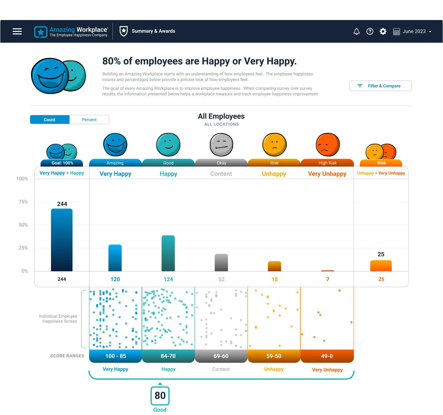 Removing all doubt, Amazing Workplace’s survey system uses advanced technology to provide survey participants’ real time feedback. At the end of each survey section, employees are presented with a happiness feeling based on their answers and are candidly asked if it accurately represents how they feel. Employees have an opportunity to confirm or change their happiness feelings to more accurately represent how they feel. At the conclusion, you, the manager, receive the most comprehensive and actionable information available from an employee survey.